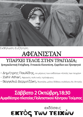 Οι εκδόσεις «Εκτός των Τειχών» σας προσκαλούν στην ανοιχτή εκδήλωση που διοργανώνουν το Σάββατο, 2 Οκτώβρη, στη Θεσσαλονίκη με θέμα: «Αφγανιστάν: Υπάρχει τέλος στην τραγωδία; Ιμπεριαλιστική επέμβαση, γυναικεία καταπίεση, εμφύλιοι και προσφυγιά».