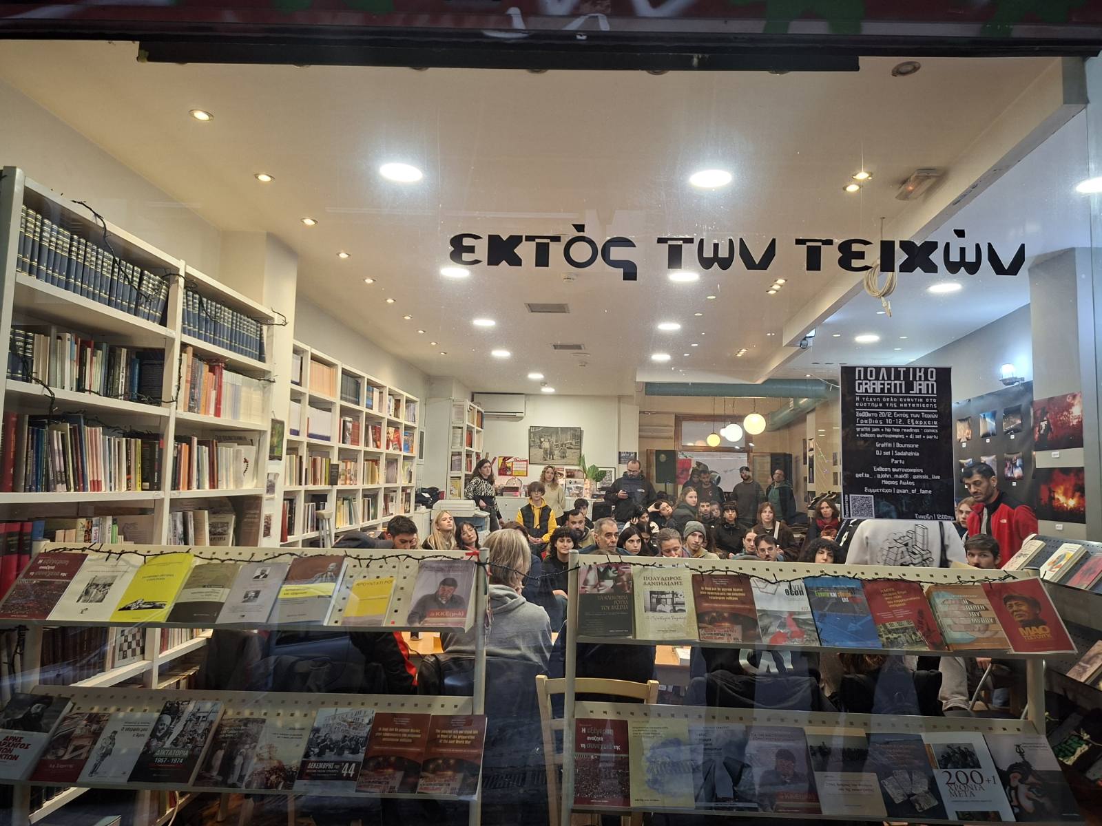 Γέμισε κόσμο το «Εκτός των Τειχών» το Σάββατο 20/12. Από τις 12 το μεσημέρι ξεκίνησε το graffiti στην αυλή, ενώ στον χώρο λειτουργούσε καθ’ όλη τη διάρκεια της ημέρας έκθεση φωτογραφίας από τους @ef.ta_, @john_mak91, @zissis_live και @marioslolos. Παράλληλα, υπήρχε πλήθος βιβλίων γύρω από το hip-hop, το graffiti, την Παλαιστίνη, comics και πολλά ακόμη. Στον χώρο υπήρχαν επίσης μπλουζάκια για την Παλαιστίνη, ενώ συμμετείχε και το Van of Fame.
