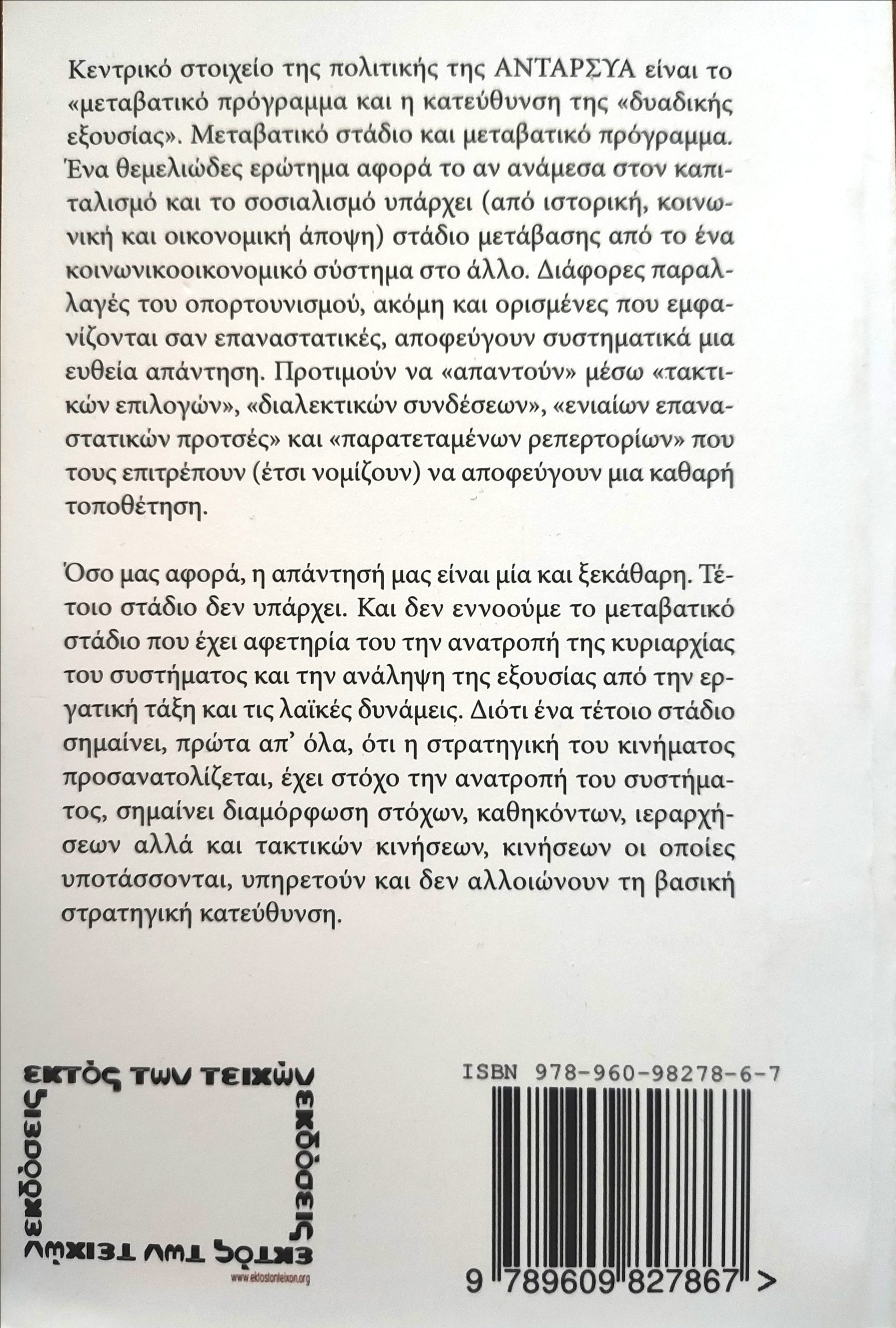 Κεντρικό στοιχείο της πολιτικής της ΑΝΤΑΡΣΥΑ είναι το «μεταβατικό πρόγραμμα και η κατεύθυνση της «δυαδικής εξουσίας». Μεταβατικό στάδιο και μεταβατικό πρόγραμμα. Ένα θεμελιώδες ερώτημα αφορά το αν ανάμεσα στον καπιταλισμό και το σοσιαλισμό υπάρχει (από ιστορική, κοινωνική και οικονομική άποψη) στάδιο μετάβασης από το ένα κοινωνικοοικονομικό σύστημα στο άλλο. Διάφορες παραλλαγές του οπορτουνισμού, ακόμη και ορισμένες που εμφανίζονται σαν επαναστατικές, αποφεύγουν συστηματικά μια ευθεία απάντηση. Προτιμούν να «απαντούν» μέσω «τακτικών επιλογών», «διαλεκτικών συνδέσεων», «ενιαίων επαναστατικών προτσές» και «παρατεταμένων ρεπερτορίων» που τους επιτρέπουν (έτσι νομίζουν) να αποφεύγουν μια καθαρή τοποθέτηση.