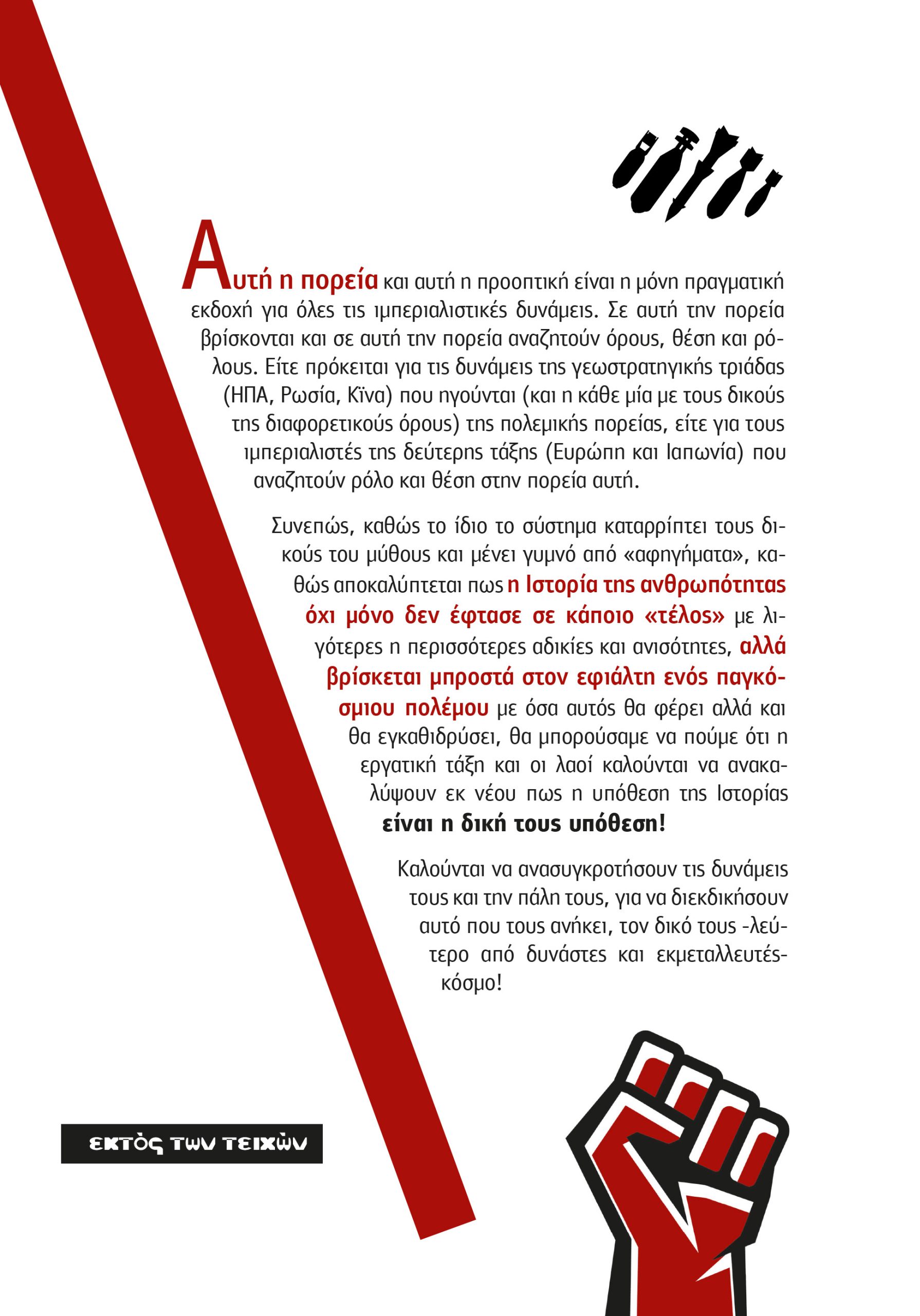 Η εισαγωγή αυτή ολοκληρωνόταν όταν ξεκίνησε η νέα πολεμική επιδρομή των ΗΠΑ-Ισραήλ ενάντια στο Ιράν. Μια επιδρομή που με την κυνικότητα, την ωμότητα και τη δυναμική που έχει θεωρούμε πως αποτελεί απεχθή αλλά ισχυρό συνήγορο για τις ανάγκες έκδοσης αυτής της μπροσούρας. Οι παγκόσμιοι στόχοι που οι ΗΠΑ προωθούν απέναντι στους ανταγωνιστές τους Ρωσία και Κίνα με την επιδρομή αυτή, το ματοκύλισμα του λαού του Ιράν και οι πολύ σοβαροί κίνδυνοι που διαμορφώνονται για τους λαούς της περιοχής και για το λαό μας, αποτελούν μια σημαντική κλιμάκωση των μέχρι τώρα πολεμικών δεδομένων στον πλανήτη, παράγουν ένταση της πολεμικής δράσης της Ρωσίας στην Ουκρανία, και αναζήτηση απαντήσεων από την Κίνα. Σε αυτή τη βάση ακόμα πιο επιτακτική προβάλλει η ανάγκη της αντιιμπεριαλιστικής-αντιπολεμικής πάλης και η ανάδειξη των πολιτικών-ιδεολογικών ζητημάτων που υπηρετούν την πάλη αυτή και στα οποία η μπροσούρα αυτή φιλοδοξεί να συμβάλλει.